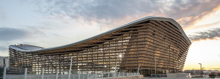 Das Aquatics Centre wird ein kohlenstoffarmes Gebäude sein und beim Bau wurden Naturbaustoffe verwendet. Die Holzkonstruktion und der Dachrahmen wurden so konzipiert, dass sich das Gebäude nahtlos in die grüne Umgebung einfügt.