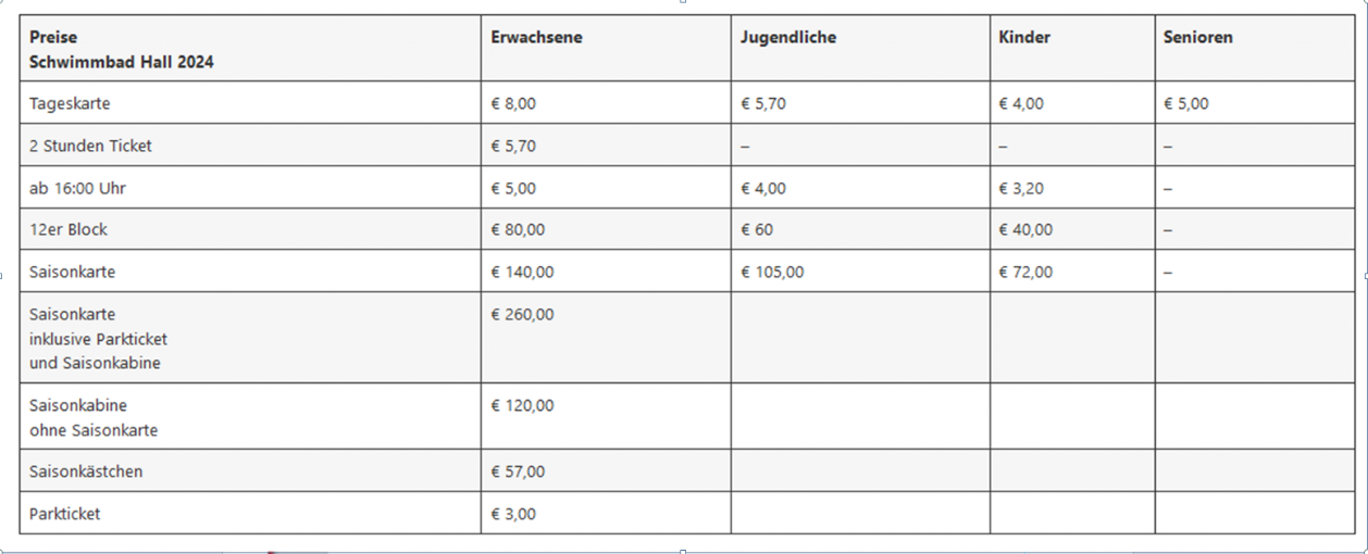 Eintrittspreise im Schwimmbad Hall – Saison 2024: